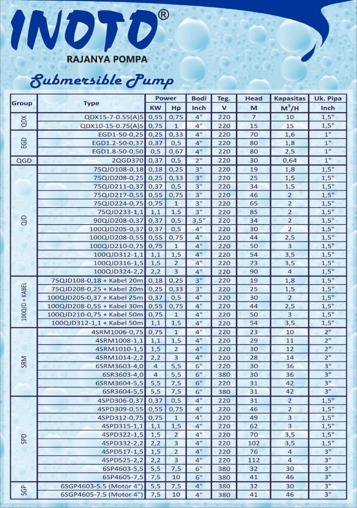 Group Type Power KW Power Hp Bodi Inch Teg. V Head M Kapasitas M3H Uk. Pipa Inch